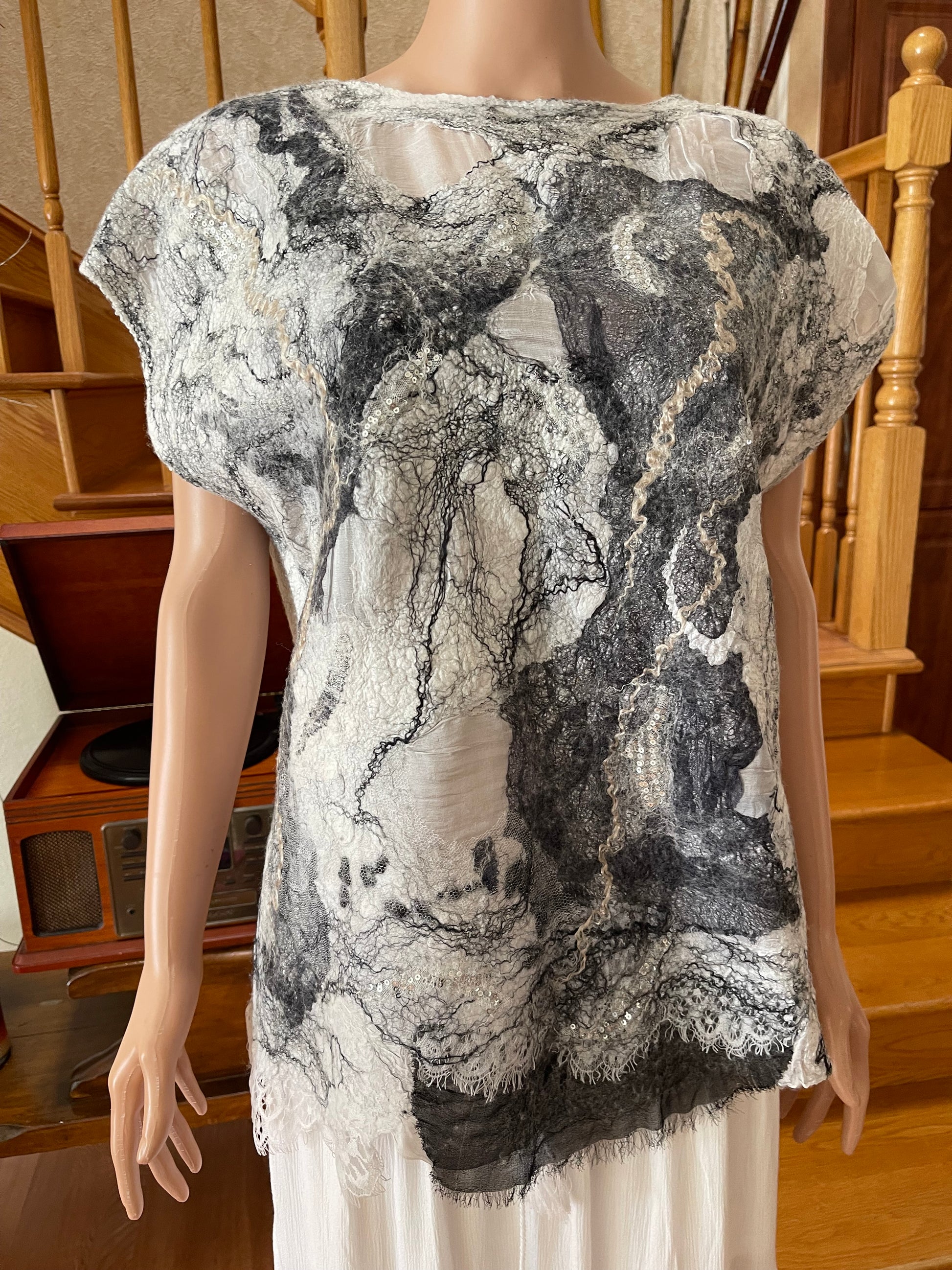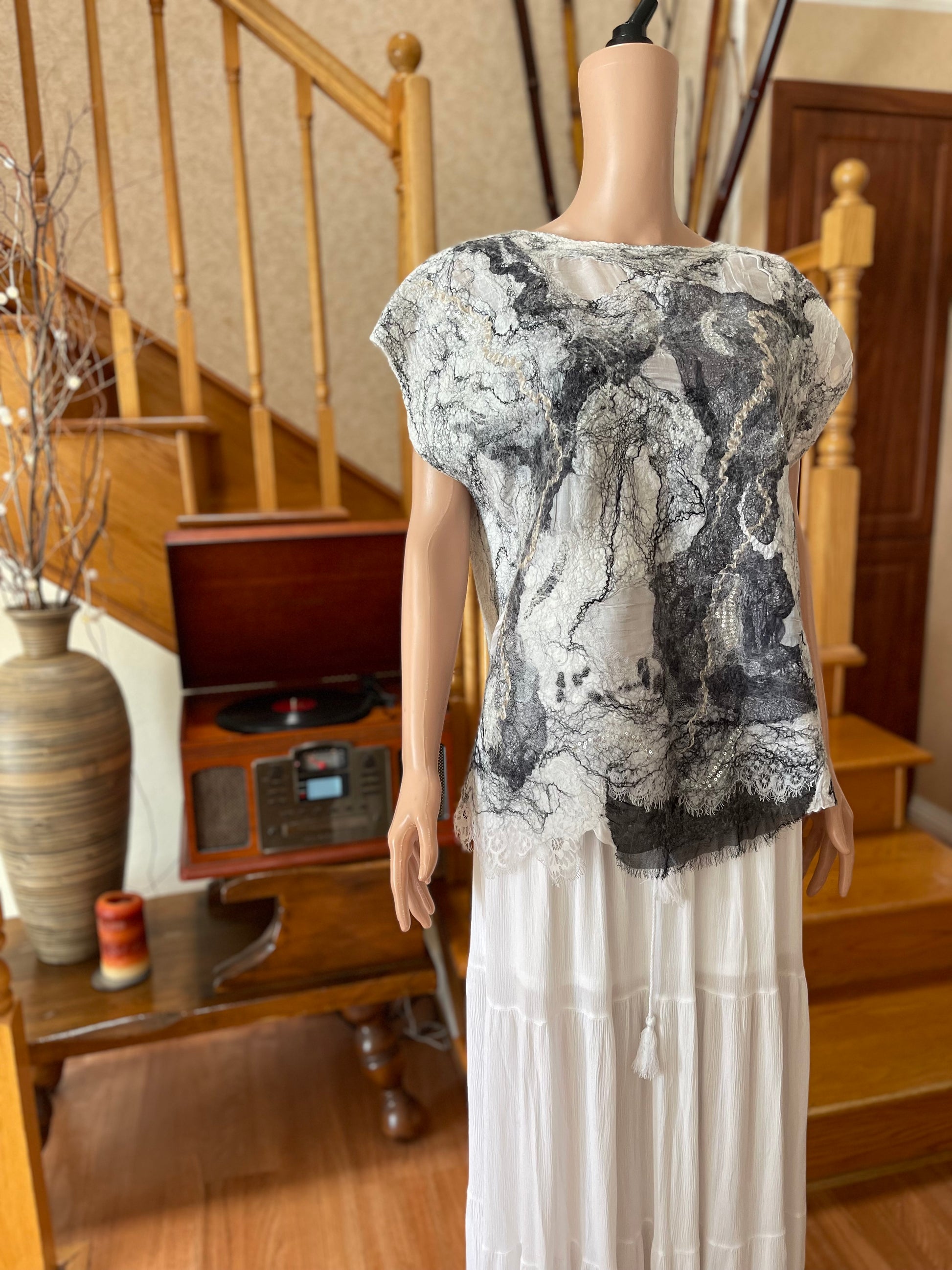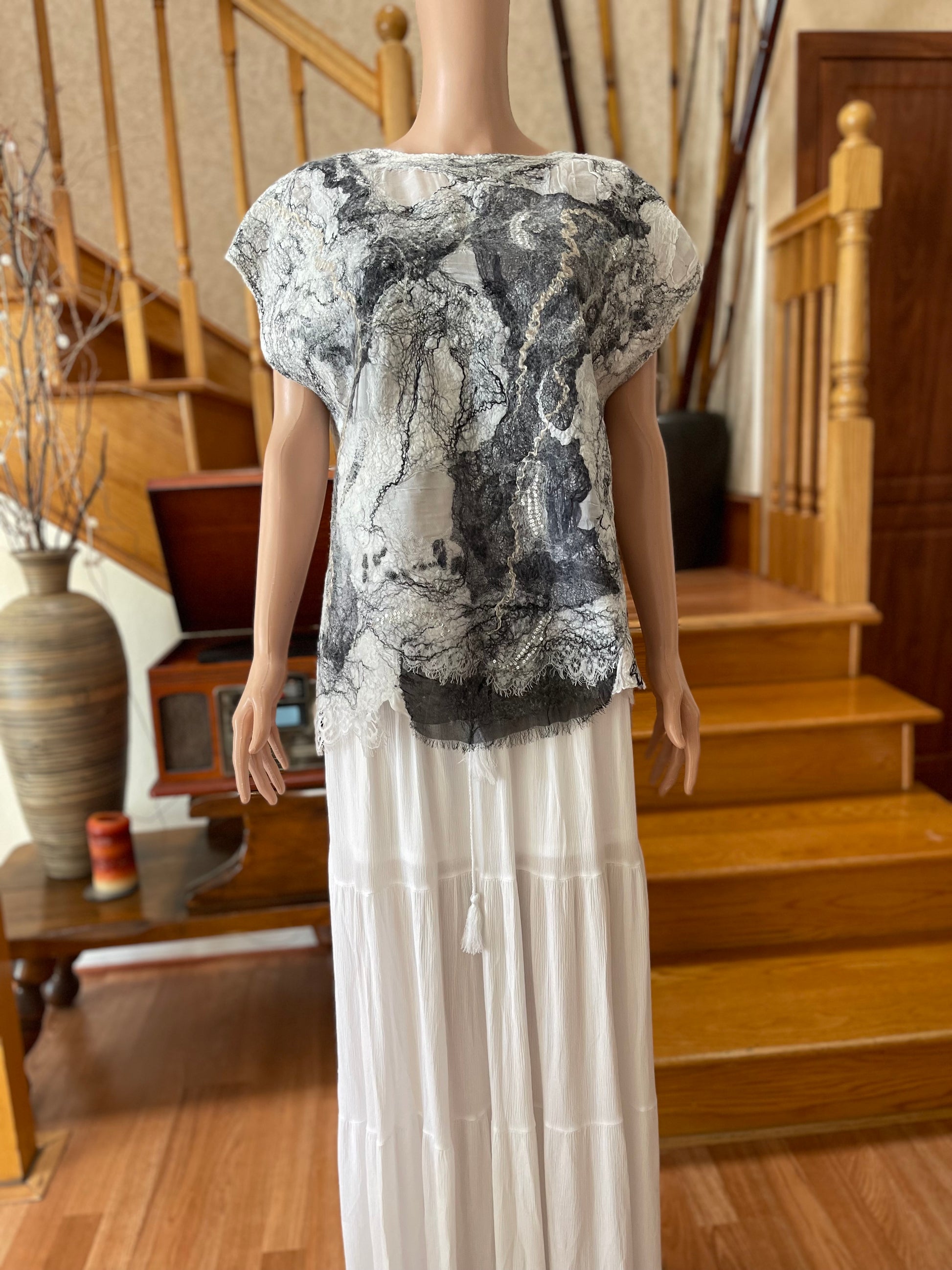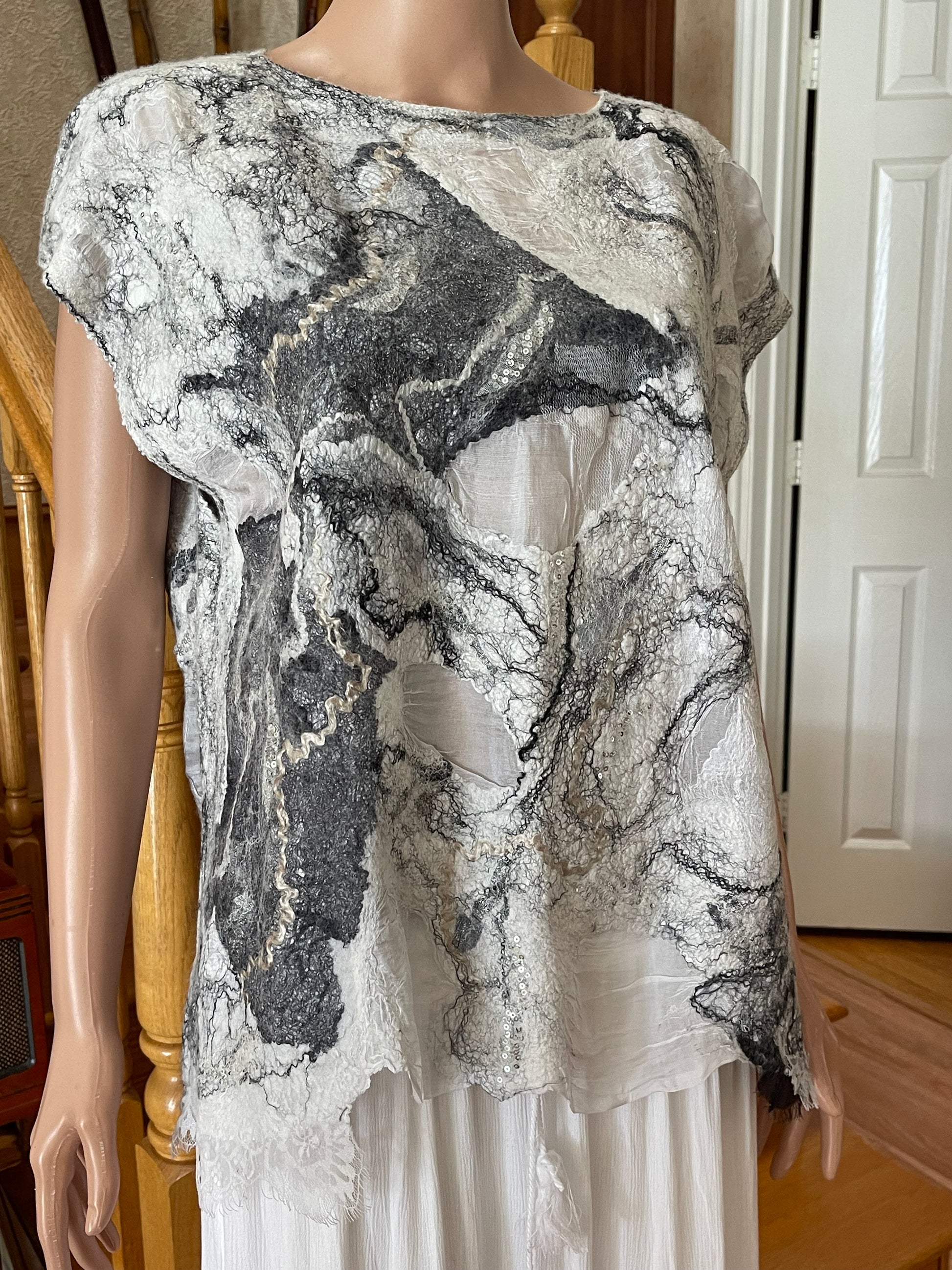 One Size. 100% natural, handmade wearable art. This delicate gauze silk top/tunic/blouse/waistcoat/ sweater/ blouse made from unique soft merino wool ,fleece,silk, cotton, bamboo, linen .Made in of wet felting technique. Completely handmade. Author's design. Light ,cozy and pleasant tactually. One size.Good for Size S-L. Recommendations for care - Dry clean.No washing machine . Gentle hand wash; 1) Place the item in room temperature water with soap for wool and silk fabric and soak it for couple hours or overnight 2) let it drain squeeze it,don’t twist it and put it in room temperature water for rinsing 3) Rinse gently ,do not twist, let the water runoff 4) Gently stretch to get the original shape 5) Spread it on the towel and let it dry 6) You can iron it with steam at wool and silk settings. Feel free to ask me any questions. Real colors may slightly differ from their appearance on your display, as it depends on your monitor settings. Thanks for visiting my store, take a look at my other items and let me know if you have any questions.