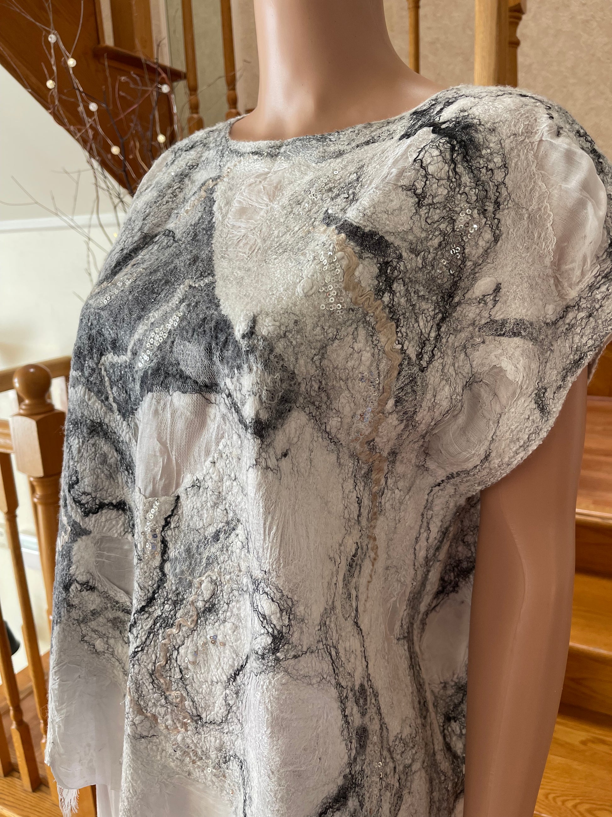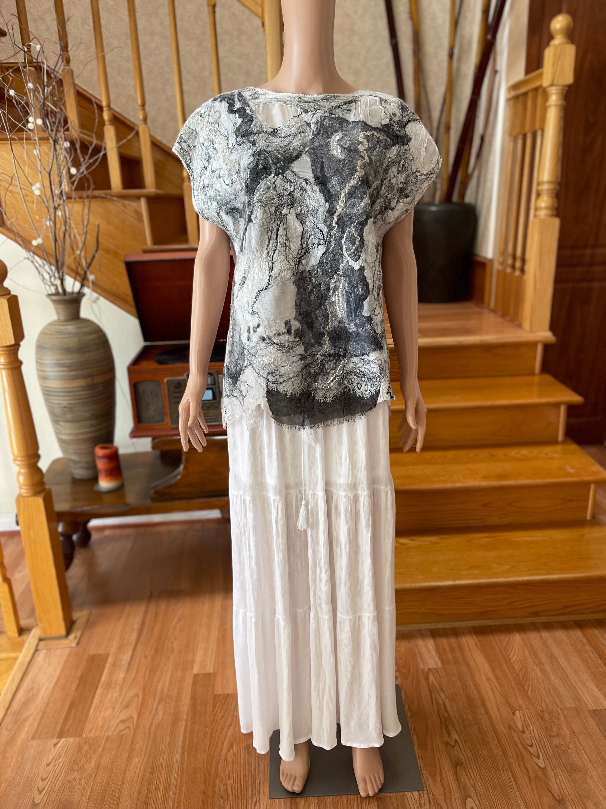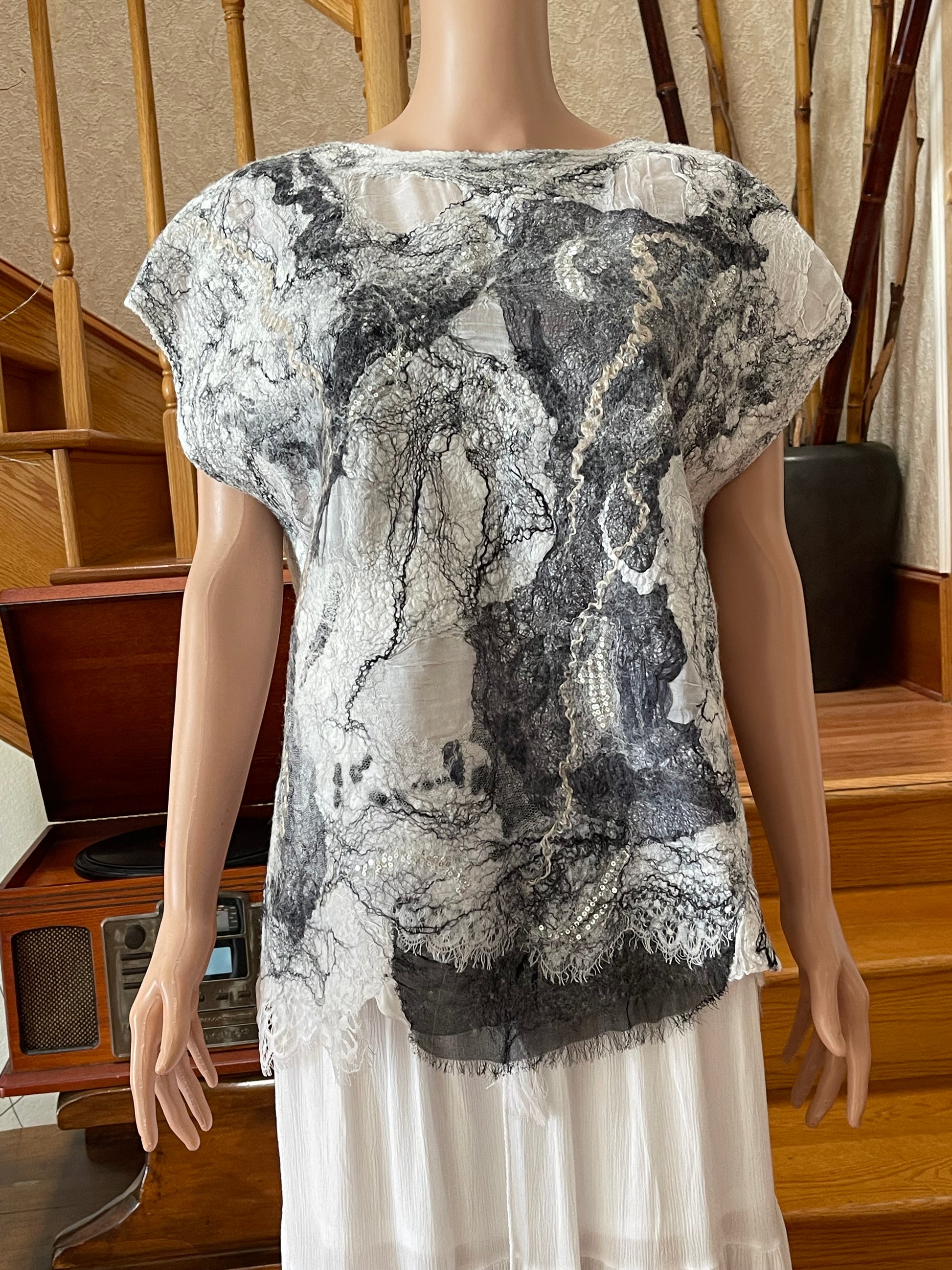 One Size. 100% natural, handmade wearable art. This delicate gauze silk top/tunic/blouse/waistcoat/ sweater/ blouse made from unique soft merino wool ,fleece,silk, cotton, bamboo, linen .Made in of wet felting technique. Completely handmade. Author's design. Light ,cozy and pleasant tactually. One size.Good for Size S-L. Recommendations for care - Dry clean.No washing machine . Gentle hand wash; 1) Place the item in room temperature water with soap for wool and silk fabric and soak it for couple hours or overnight 2) let it drain squeeze it,don’t twist it and put it in room temperature water for rinsing 3) Rinse gently ,do not twist, let the water runoff 4) Gently stretch to get the original shape 5) Spread it on the towel and let it dry 6) You can iron it with steam at wool and silk settings. Feel free to ask me any questions. Real colors may slightly differ from their appearance on your display, as it depends on your monitor settings. Thanks for visiting my store, take a look at my other items and let me know if you have any questions.