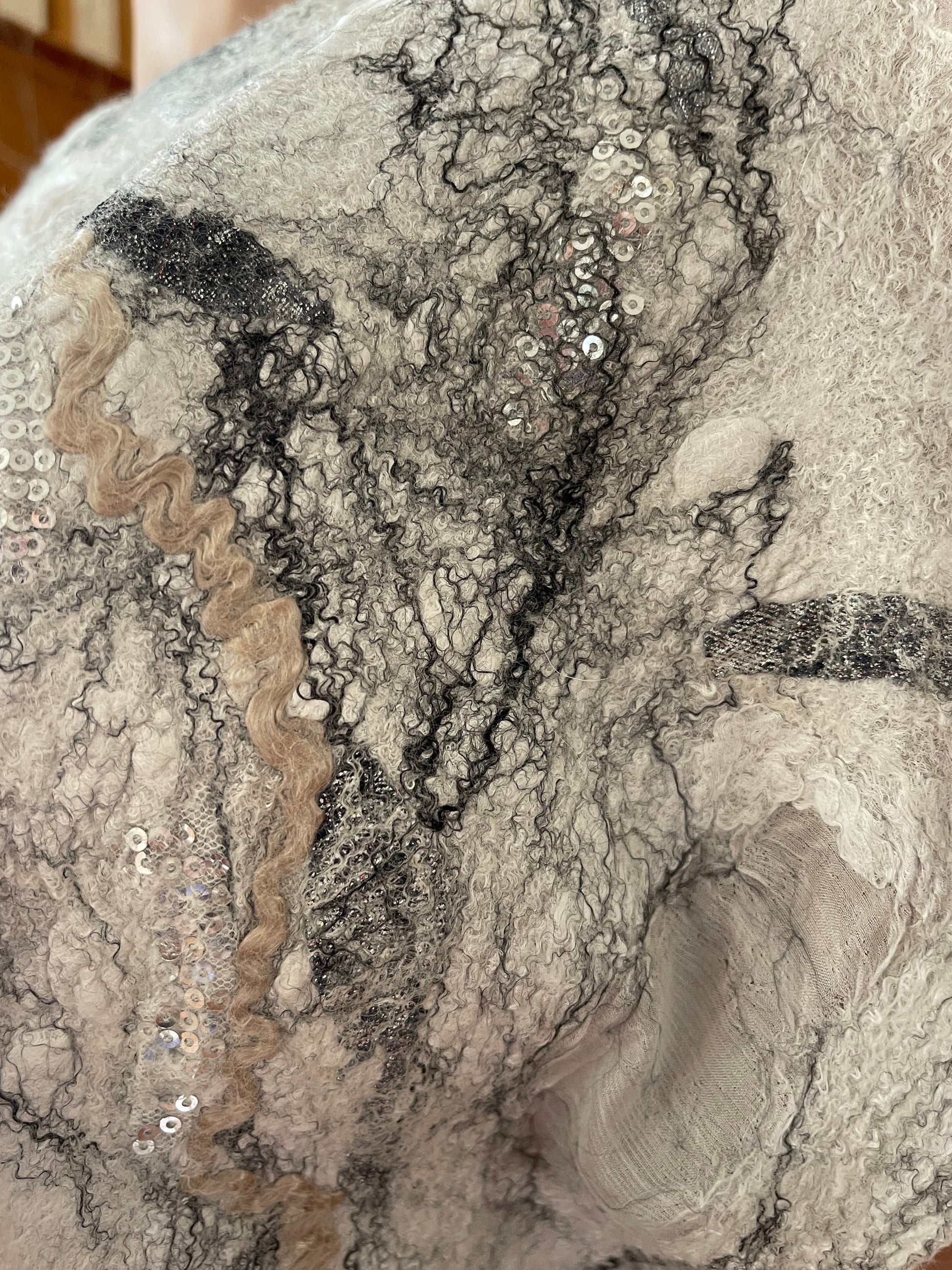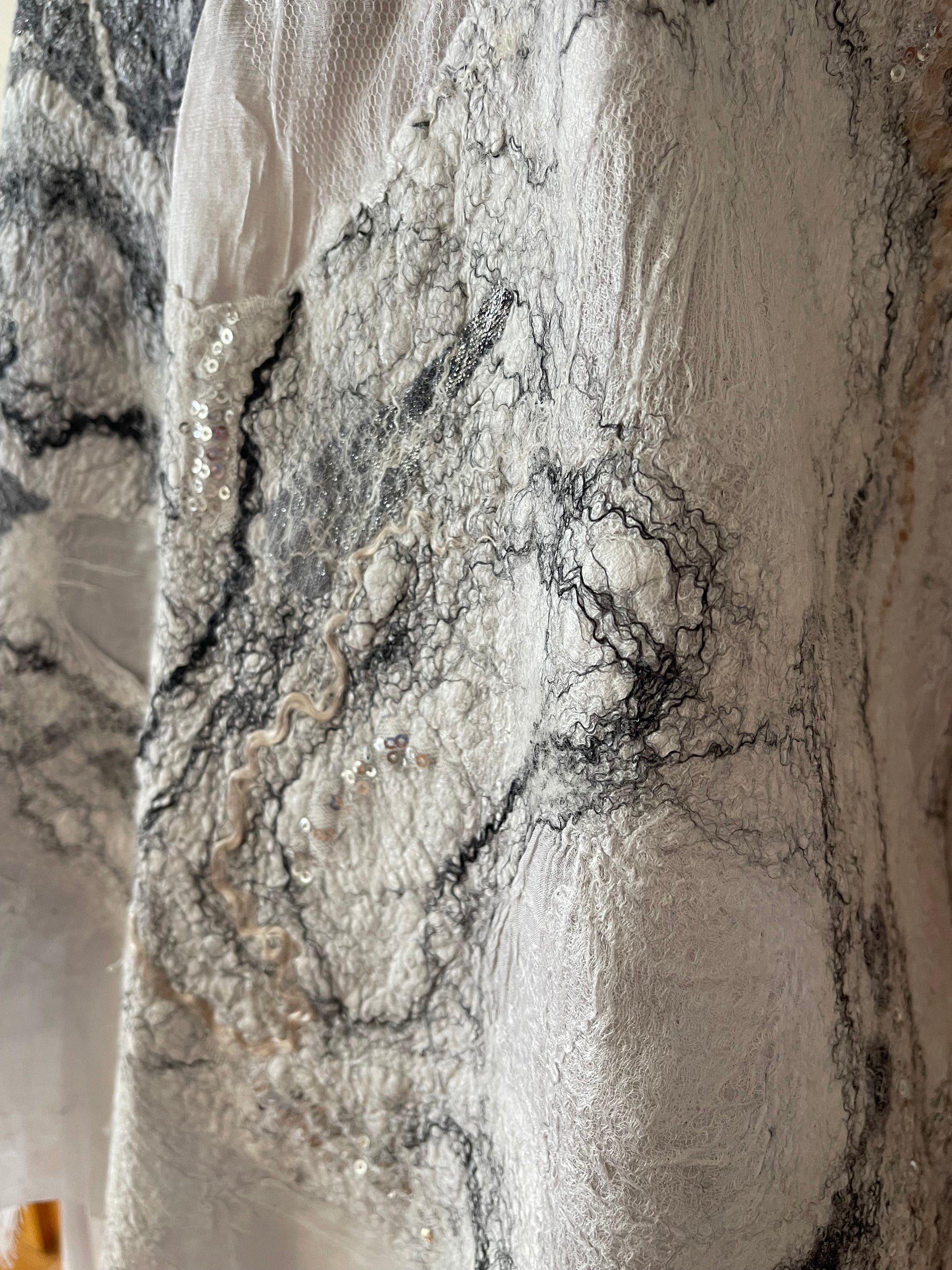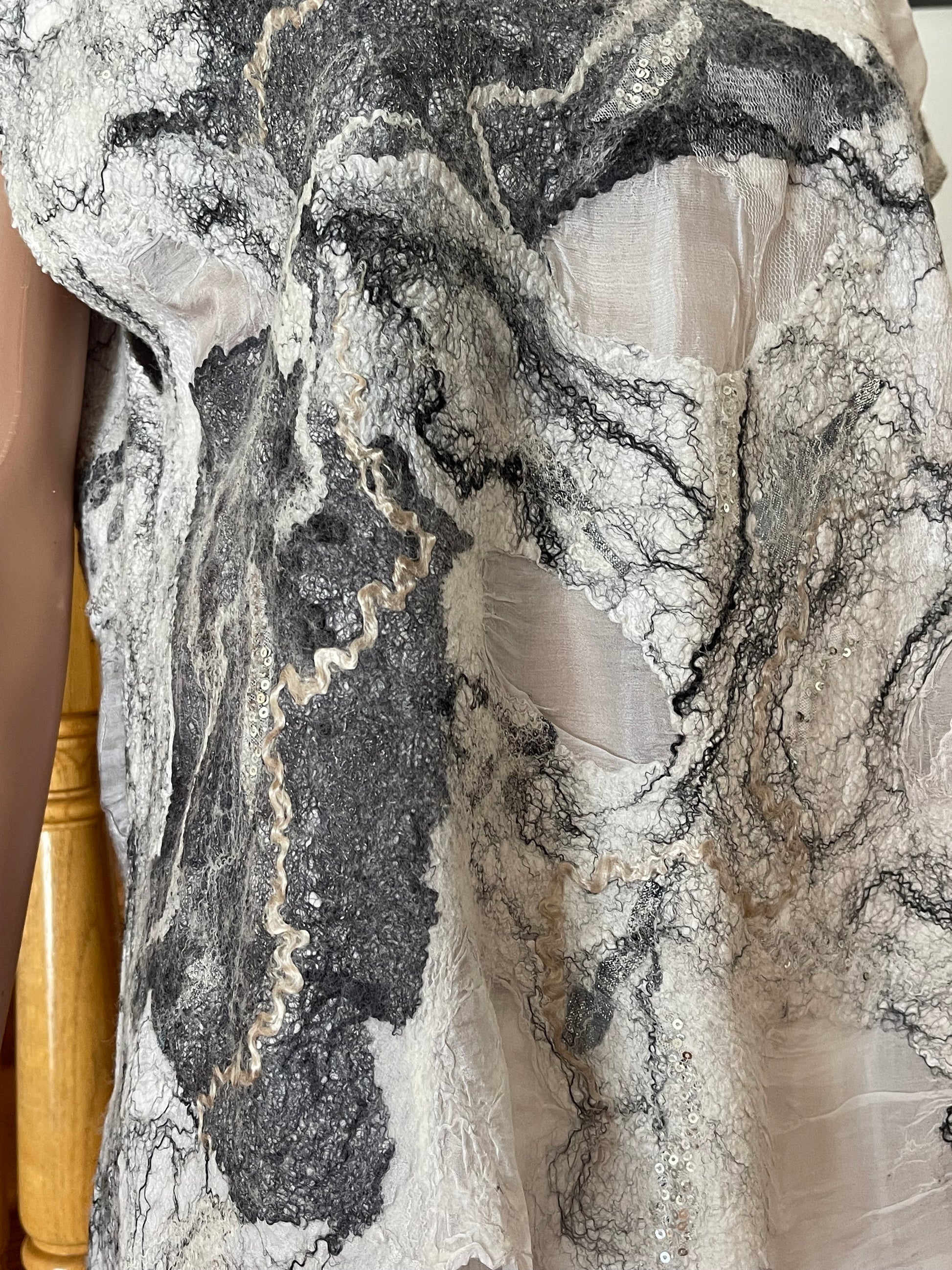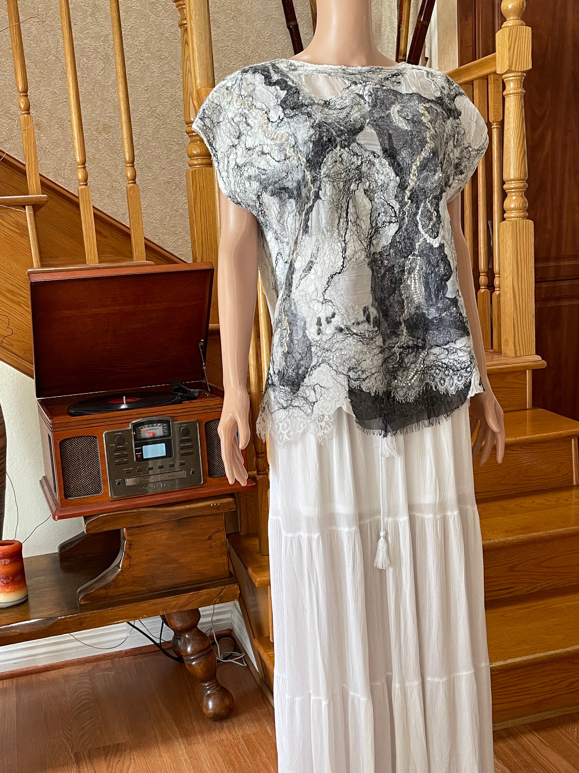 One Size. 100% natural, handmade wearable art. This delicate gauze silk top/tunic/blouse/waistcoat/ sweater/ blouse made from unique soft merino wool ,fleece,silk, cotton, bamboo, linen .Made in of wet felting technique. Completely handmade. Author's design. Light ,cozy and pleasant tactually. One size.Good for Size S-L. Recommendations for care - Dry clean.No washing machine . Gentle hand wash; 1) Place the item in room temperature water with soap for wool and silk fabric and soak it for couple hours or overnight 2) let it drain squeeze it,don’t twist it and put it in room temperature water for rinsing 3) Rinse gently ,do not twist, let the water runoff 4) Gently stretch to get the original shape 5) Spread it on the towel and let it dry 6) You can iron it with steam at wool and silk settings. Feel free to ask me any questions. Real colors may slightly differ from their appearance on your display, as it depends on your monitor settings. Thanks for visiting my store, take a look at my other items and let me know if you have any questions.