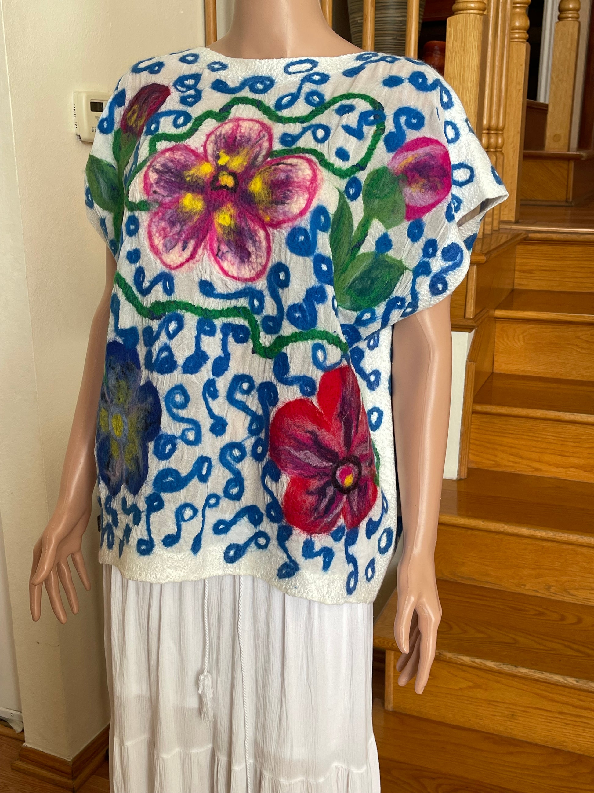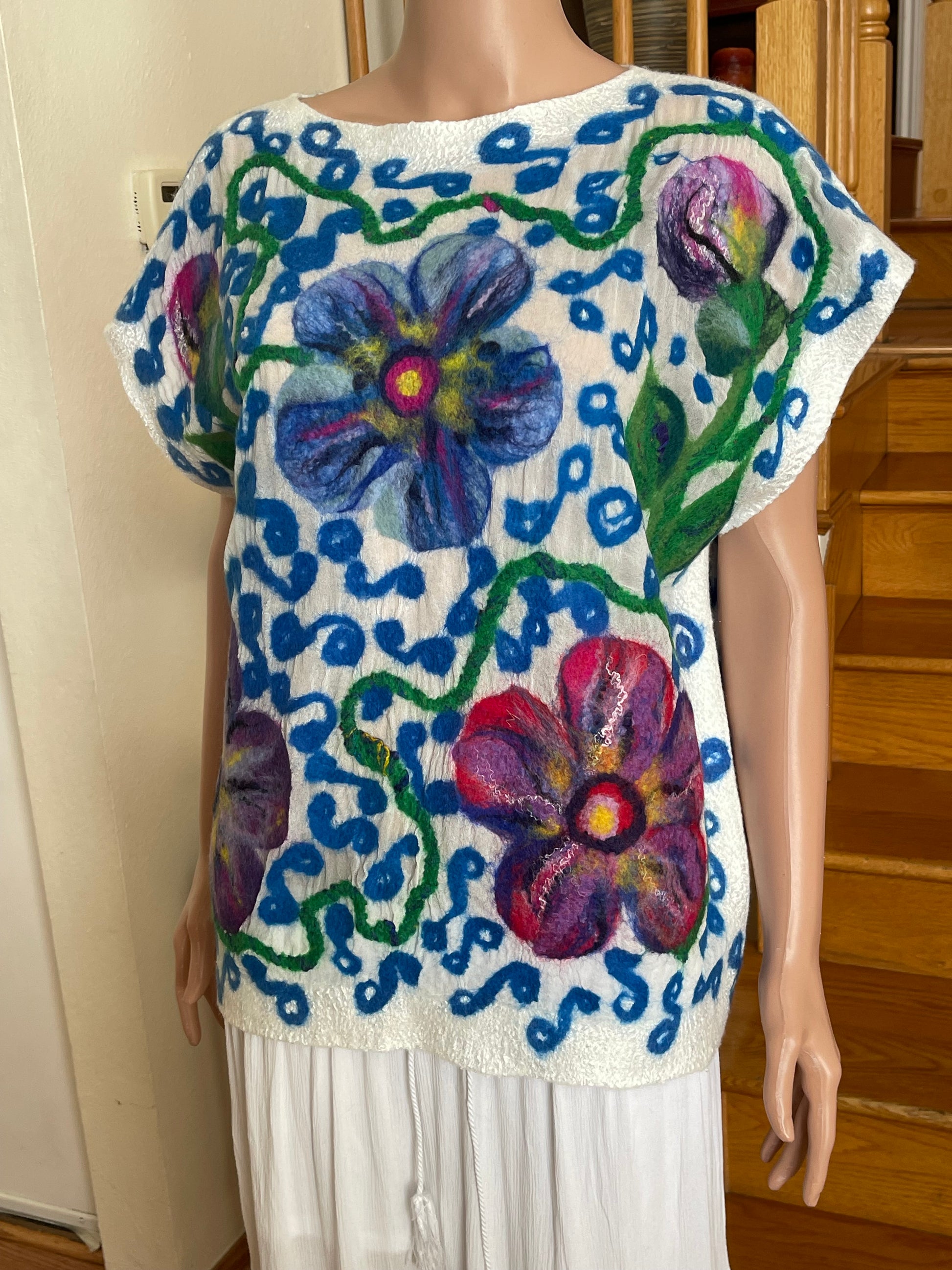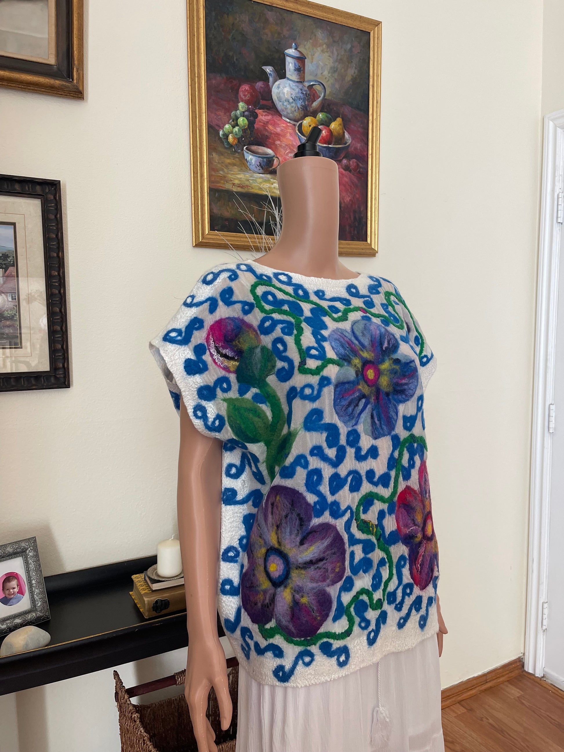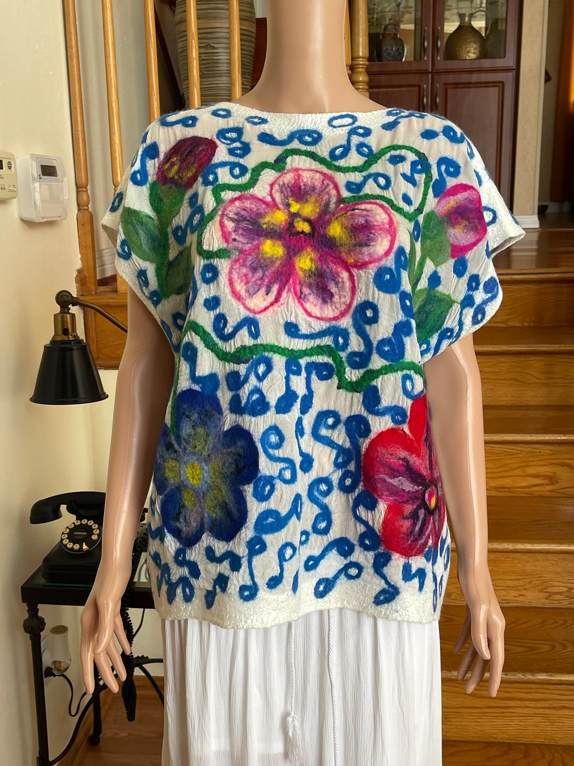 One Size 100% natural, handmade wearable art. This delicate gauze silk top/tunic/blouse/waistcoat/ sweater/ blouse made from unique soft merino wool ,fleece,silk, cotton, bamboo, linen .Made in of wet felting technique. Completely handmade. Author's design. Light ,cozy and pleasant tactually. One size.Good for Size S-XL. Recommendations for care - Dry clean.No washing machine . Gentle hand wash; 1) Place the item in room temperature water with soap for wool and silk fabric and soak it for couple hours or overnight 2) let it drain squeeze it,don’t twist it and put it in room temperature water for rinsing 3) Rinse gently ,do not twist, let the water runoff 4) Gently stretch to get the original shape 5) Spread it on the towel and let it dry 6) You can iron it with steam at wool and silk settings. Feel free to ask me any questions. Real colors may slightly differ from their appearance on your display, as it depends on your monitor settings. Thanks for visiting my store, take a look at my other items and let me know if you have any questions.