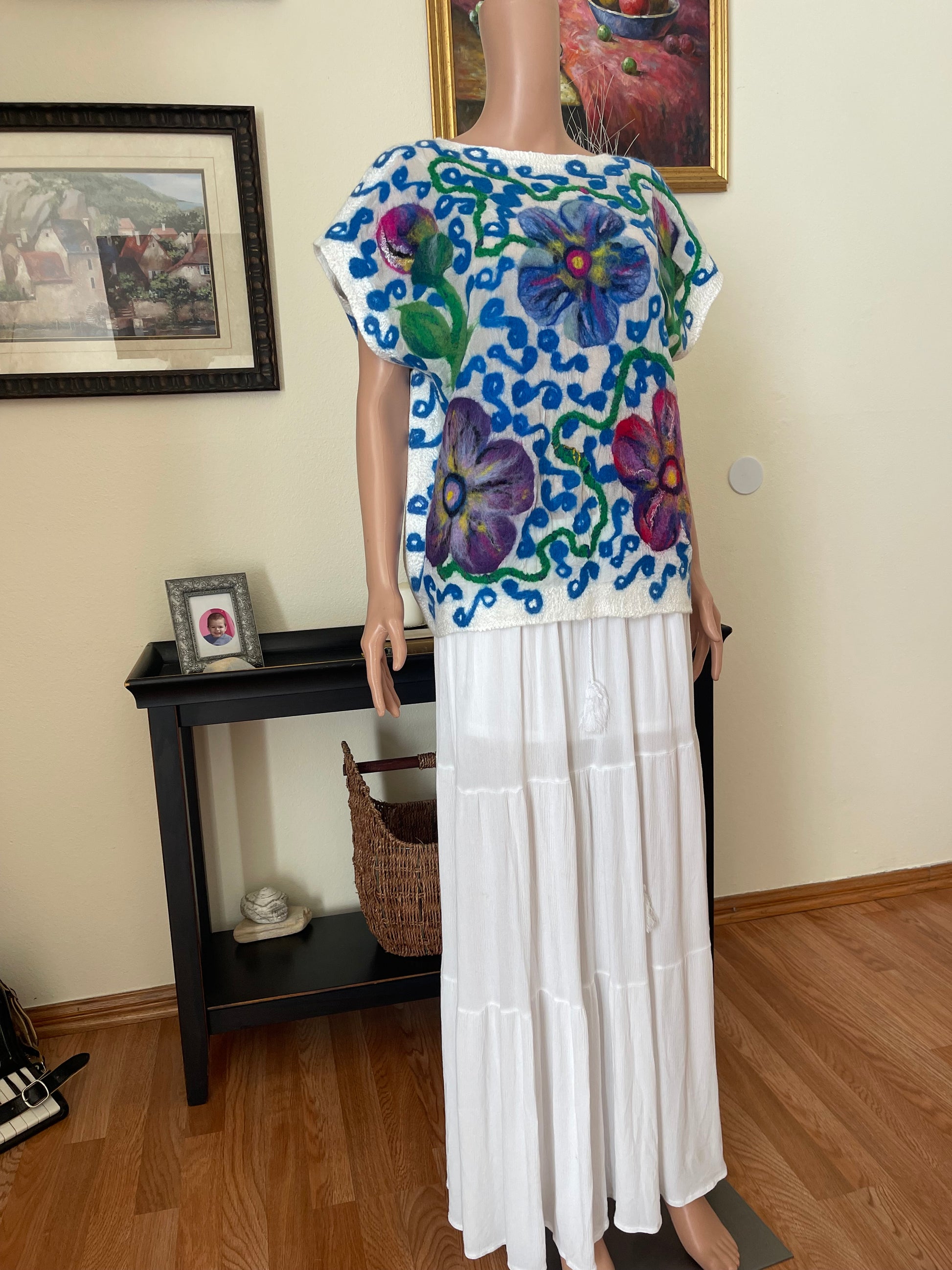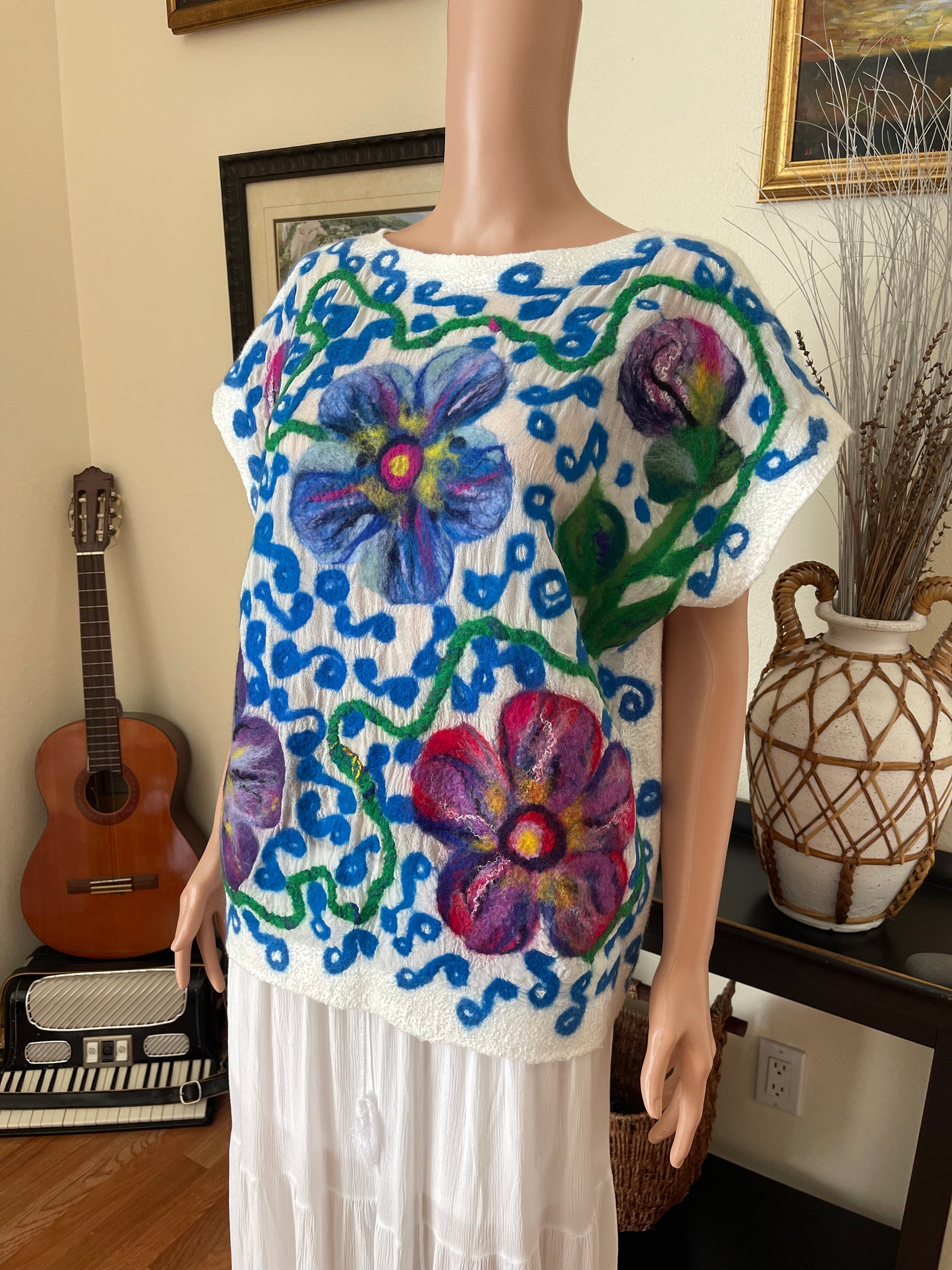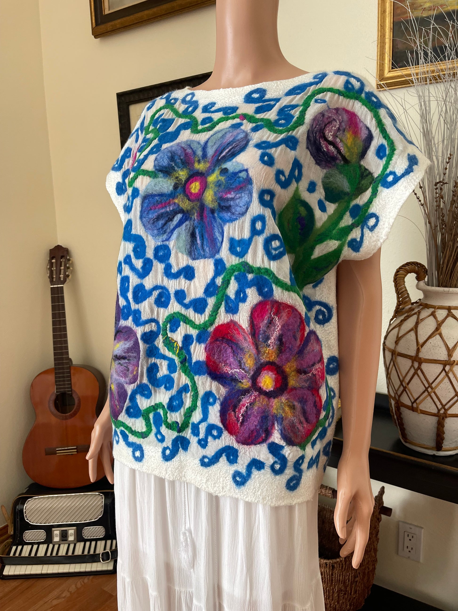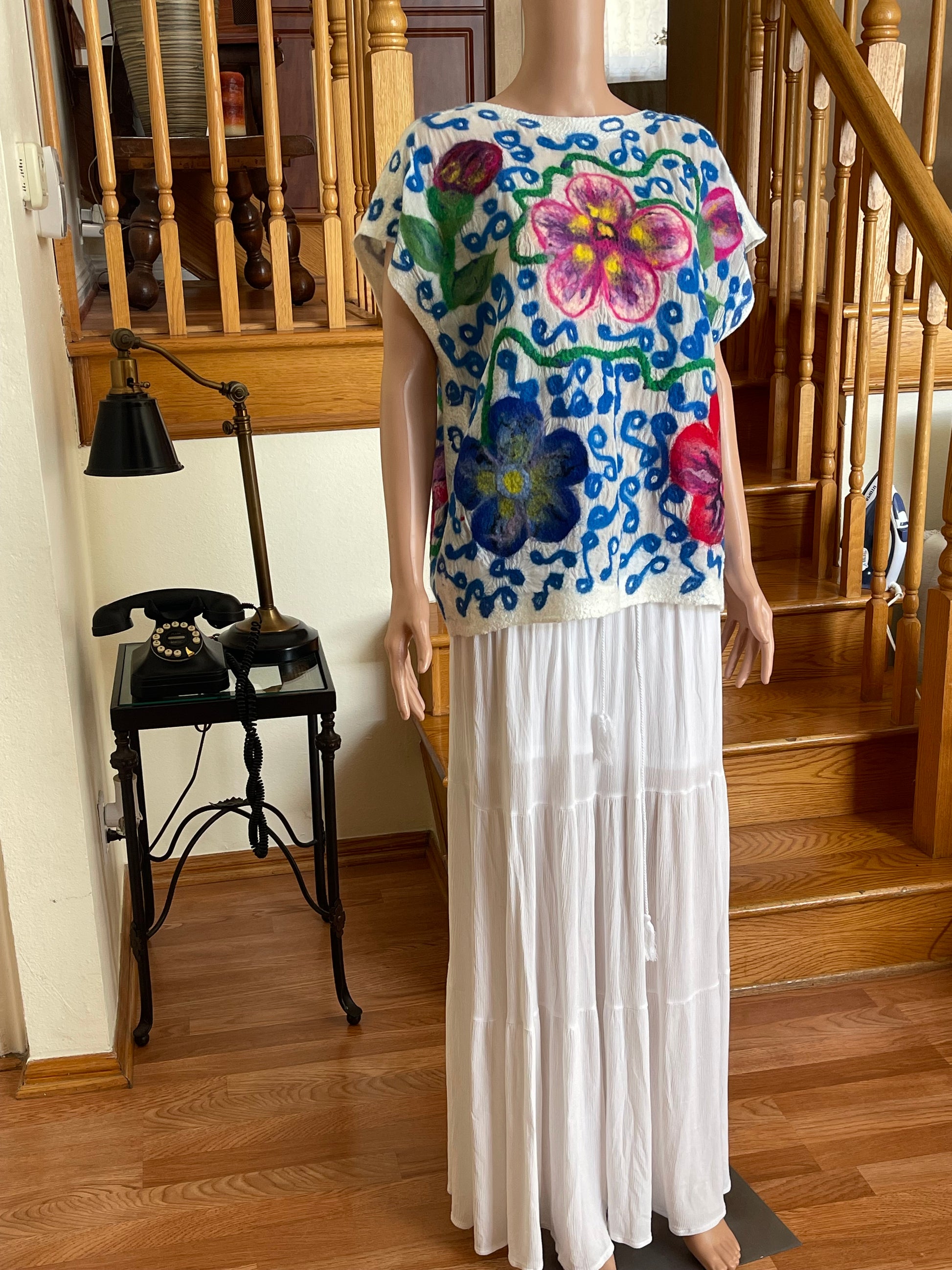 One Size 100% natural, handmade wearable art. This delicate gauze silk top/tunic/blouse/waistcoat/ sweater/ blouse made from unique soft merino wool ,fleece,silk, cotton, bamboo, linen .Made in of wet felting technique. Completely handmade. Author's design. Light ,cozy and pleasant tactually. One size.Good for Size S-XL. Recommendations for care - Dry clean.No washing machine . Gentle hand wash; 1) Place the item in room temperature water with soap for wool and silk fabric and soak it for couple hours or overnight 2) let it drain squeeze it,don’t twist it and put it in room temperature water for rinsing 3) Rinse gently ,do not twist, let the water runoff 4) Gently stretch to get the original shape 5) Spread it on the towel and let it dry 6) You can iron it with steam at wool and silk settings. Feel free to ask me any questions. Real colors may slightly differ from their appearance on your display, as it depends on your monitor settings. Thanks for visiting my store, take a look at my other items and let me know if you have any questions.