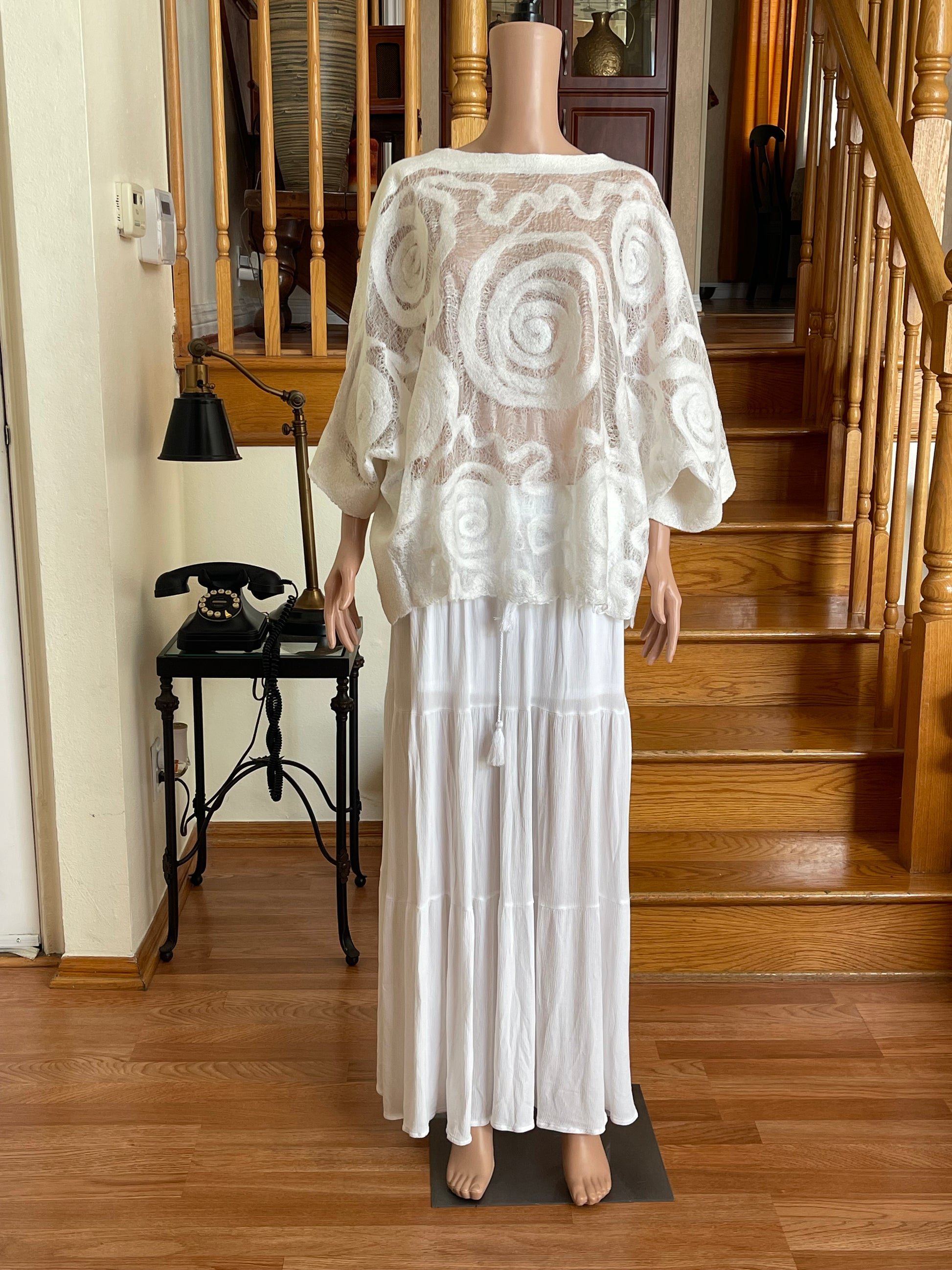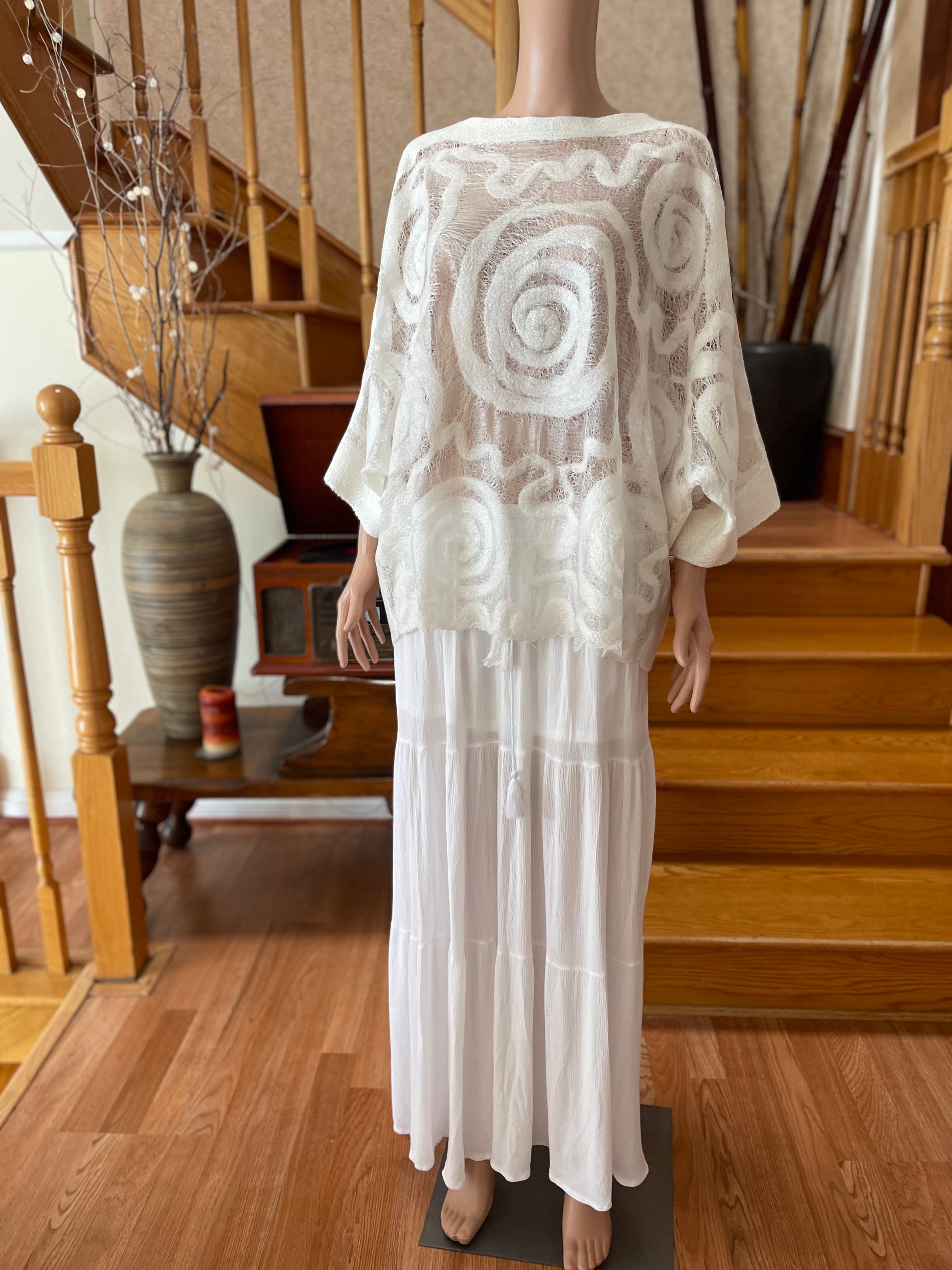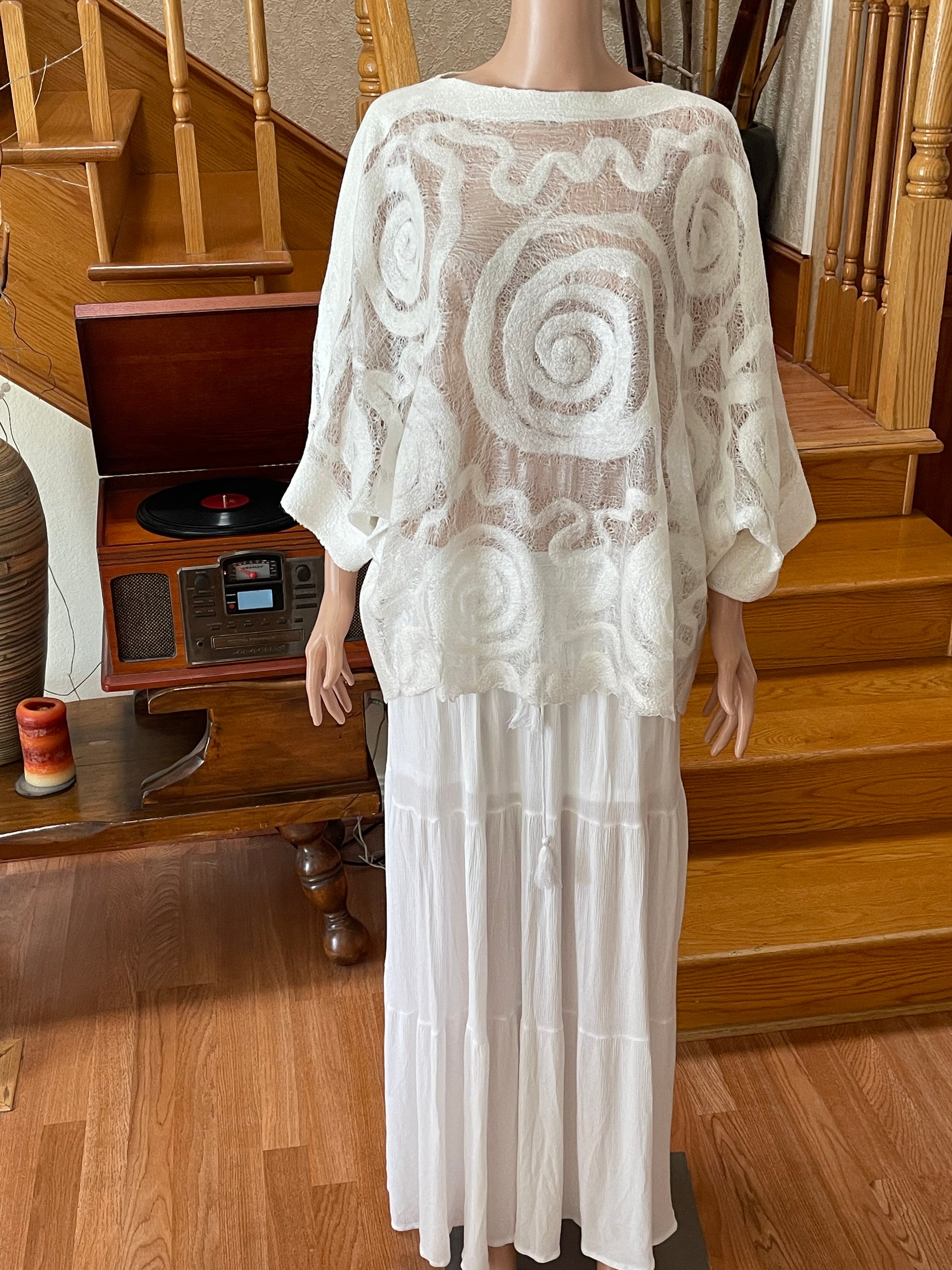 One Size. 100% natural, handmade wearable art. This delicate gauze silk top/tunic/blouse/waistcoat/ sweater/ blouse made from unique soft merino wool ,fleece,silk, cotton, bamboo, linen .Made in of wet felting technique. Completely handmade. Author's design. Light ,cozy and pleasant tactually. One size.Good for Size S-M. Recommendations for care - Dry clean.No washing machine . Gentle hand wash; 1) Place the item in room temperature water with soap for wool and silk fabric and soak it for couple hours or overnight 2) let it drain squeeze it,don’t twist it and put it in room temperature water for rinsing 3) Rinse gently ,do not twist, let the water runoff 4) Gently stretch to get the original shape 5) Spread it on the towel and let it dry 6) You can iron it with steam at wool and silk settings. Feel free to ask me any questions. Real colors may slightly differ from their appearance on your display, as it depends on your monitor settings. Thanks for visiting my store, take a look at my other items and let me know if you have any questions.