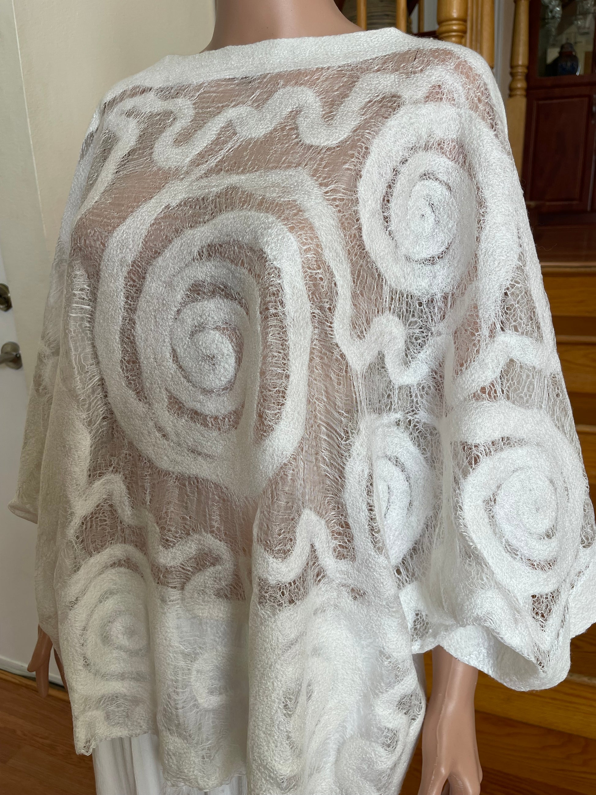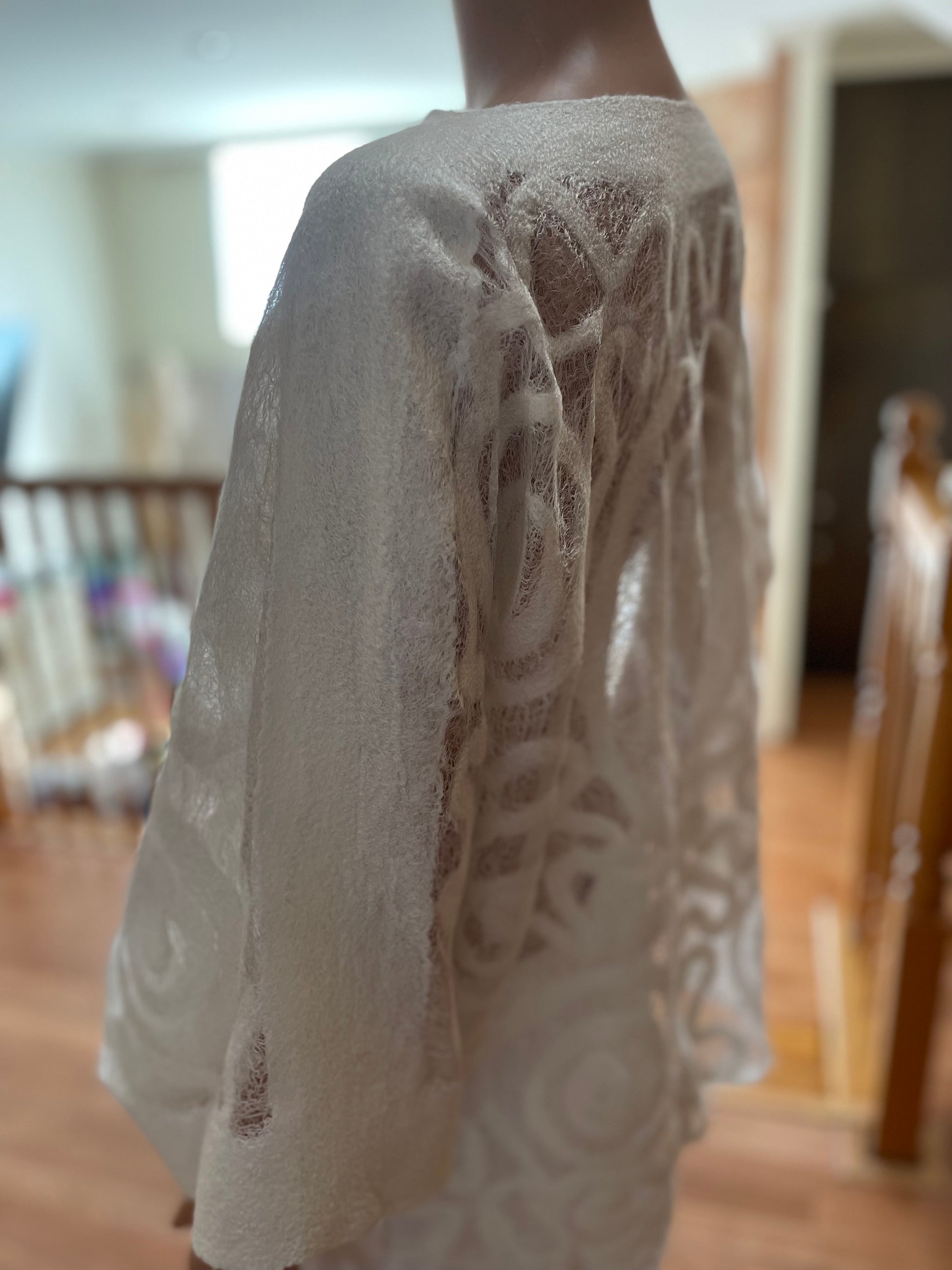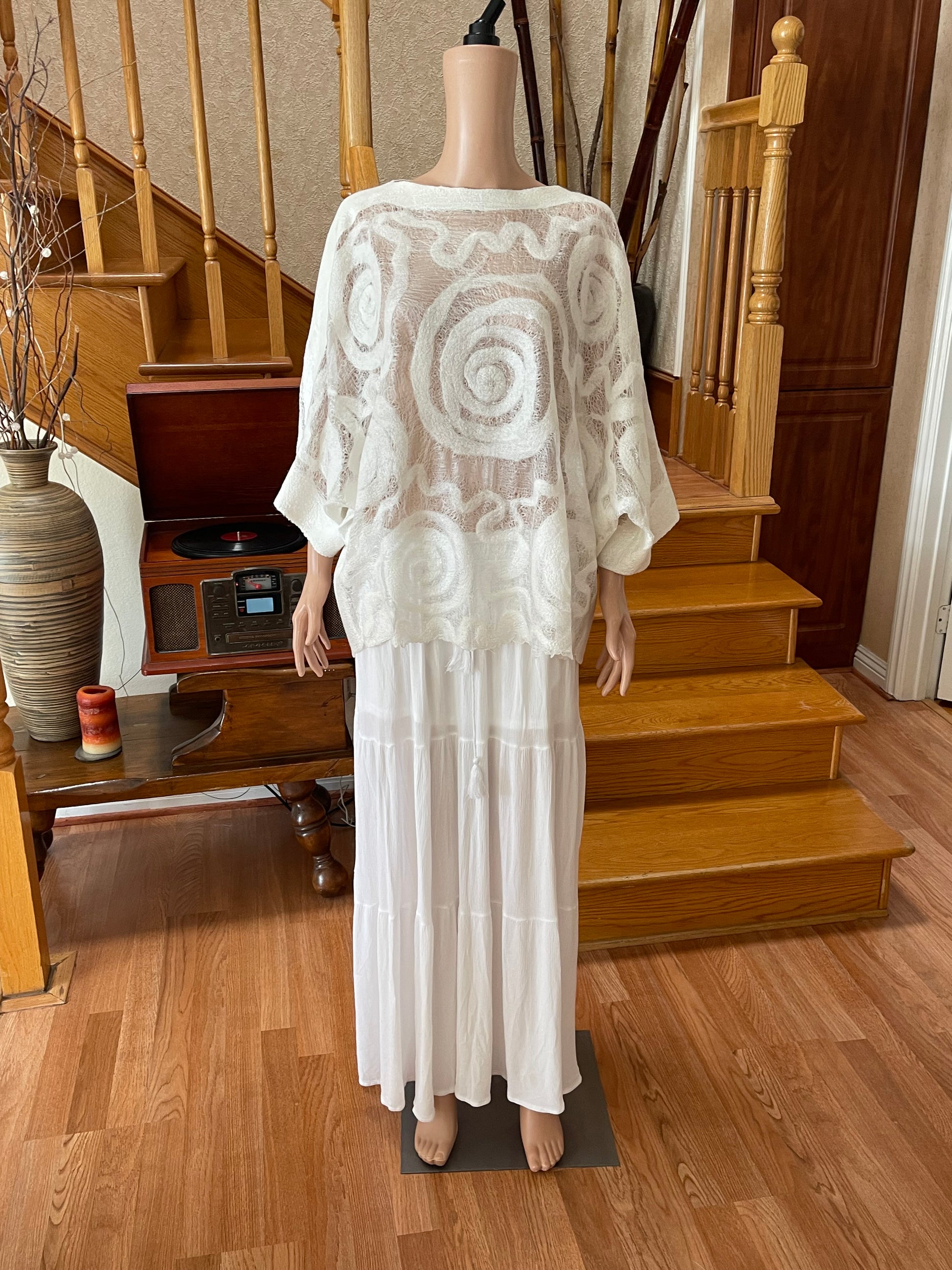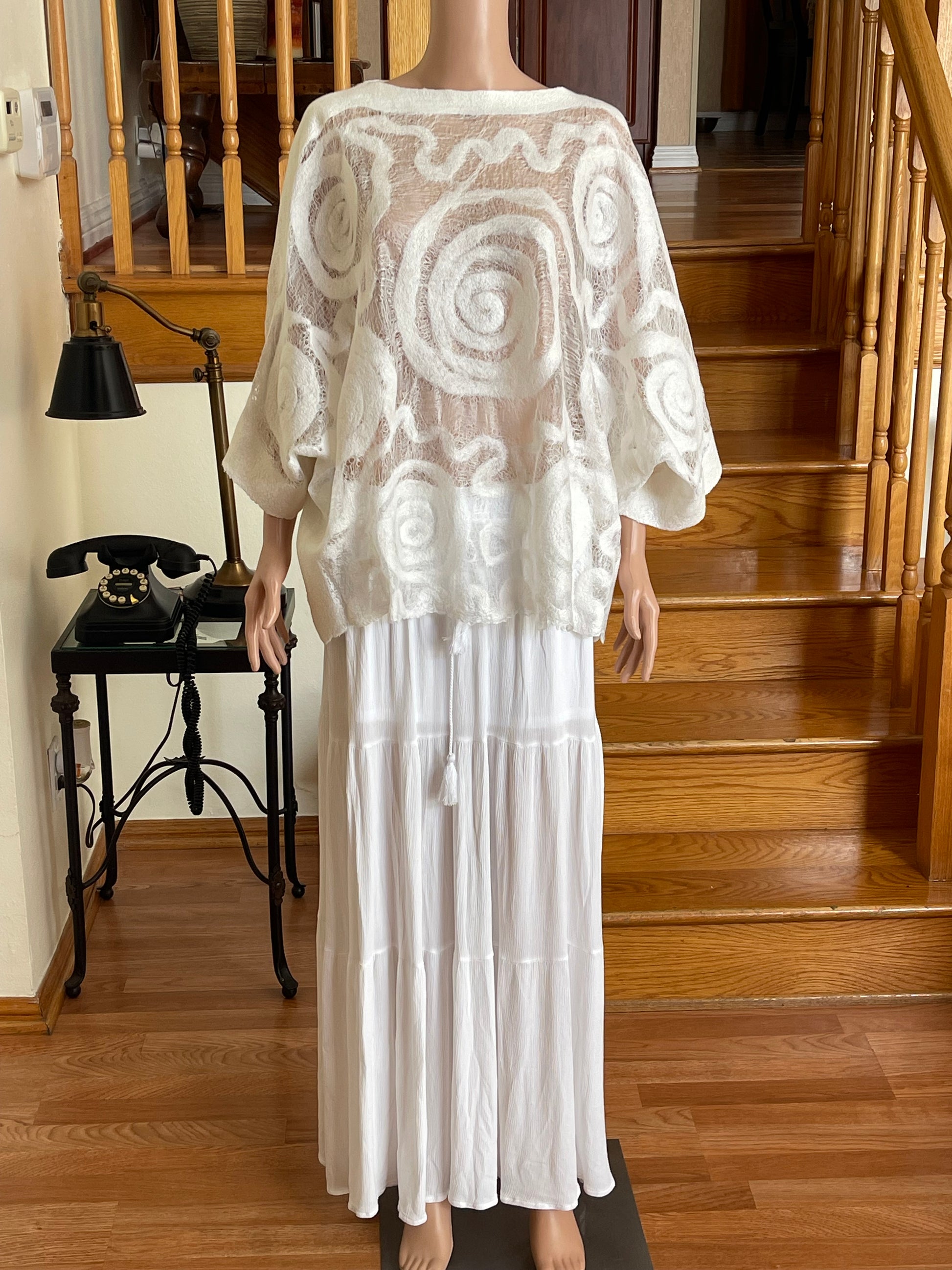 One Size. 100% natural, handmade wearable art. This delicate gauze silk top/tunic/blouse/waistcoat/ sweater/ blouse made from unique soft merino wool ,fleece,silk, cotton, bamboo, linen .Made in of wet felting technique. Completely handmade. Author's design. Light ,cozy and pleasant tactually. One size.Good for Size S-M. Recommendations for care - Dry clean.No washing machine . Gentle hand wash; 1) Place the item in room temperature water with soap for wool and silk fabric and soak it for couple hours or overnight 2) let it drain squeeze it,don’t twist it and put it in room temperature water for rinsing 3) Rinse gently ,do not twist, let the water runoff 4) Gently stretch to get the original shape 5) Spread it on the towel and let it dry 6) You can iron it with steam at wool and silk settings. Feel free to ask me any questions. Real colors may slightly differ from their appearance on your display, as it depends on your monitor settings. Thanks for visiting my store, take a look at my other items and let me know if you have any questions.