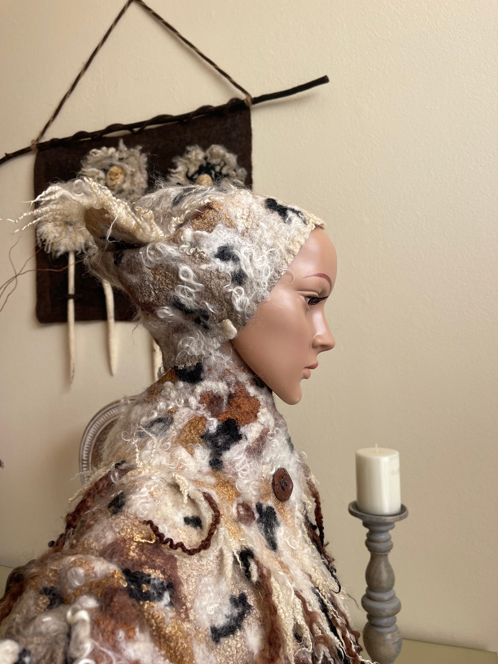 This two sides wearable unique hat and scarf set made from unique, warm and soft merino wool ,silk, cotton, bamboo, linen ,nettle , tencel, viscose .Made in of wet felting technique. Completely handmade. Author's design. Warm, cozy and pleasant tactually. Recommendations for care - No washing machine . Hand wash. 1. Place the item in room temperature water with soap for wool and silk fabric and soak it for couple hours or overnight. 2. let it drain squeeze it,don’t twist it and put it in room temperature water for rinsing. 3. Rinse gently ,do not twist, let the water runoff. 4.Gently stretch to get the original shape. 5.Spread it on the towel and let it dry. 6.You can iron it with steam at wool and silk settings. Feel free to ask me any questions. Real colors may be slightly differen from their appearance on your display, as it depends on your monitor settings. Thanks for visiting my store, take a look at my other items and let me know if you have any questions.