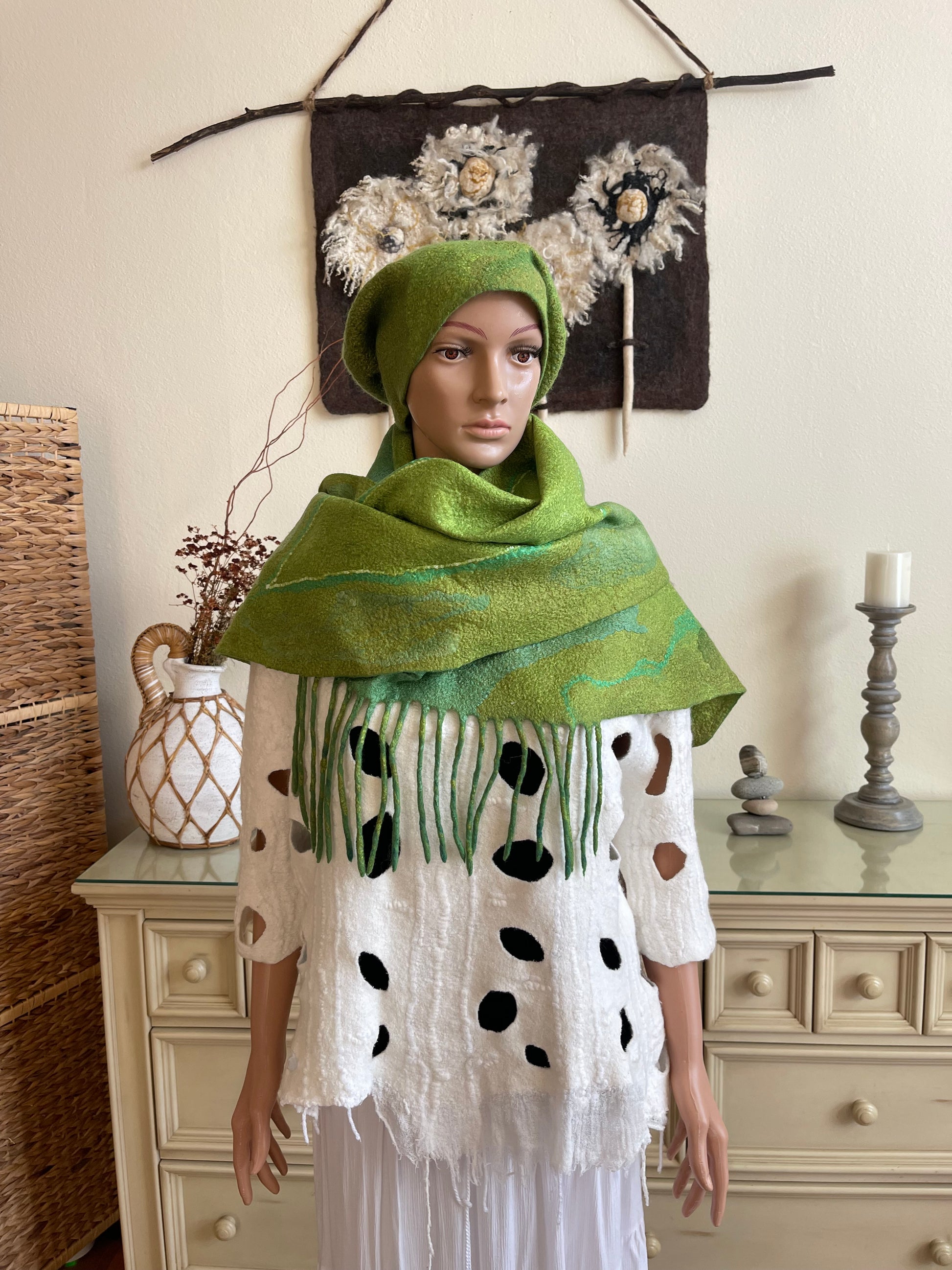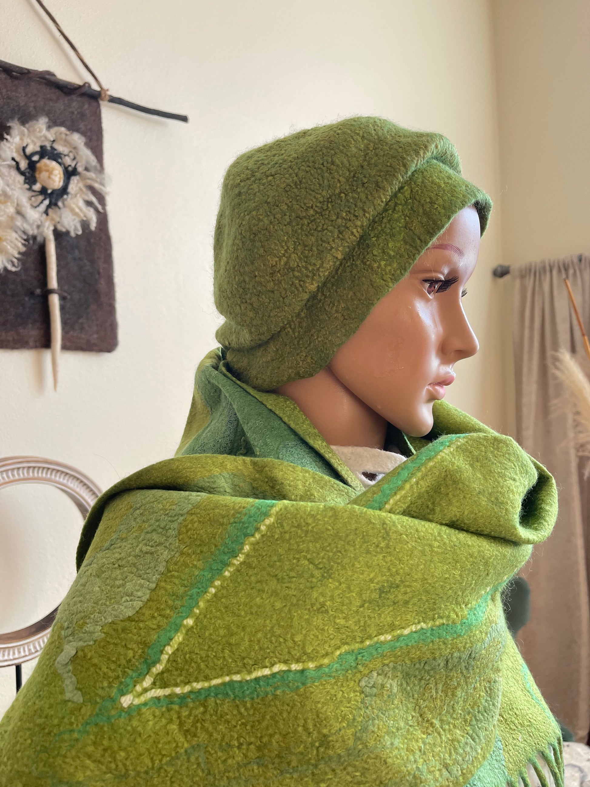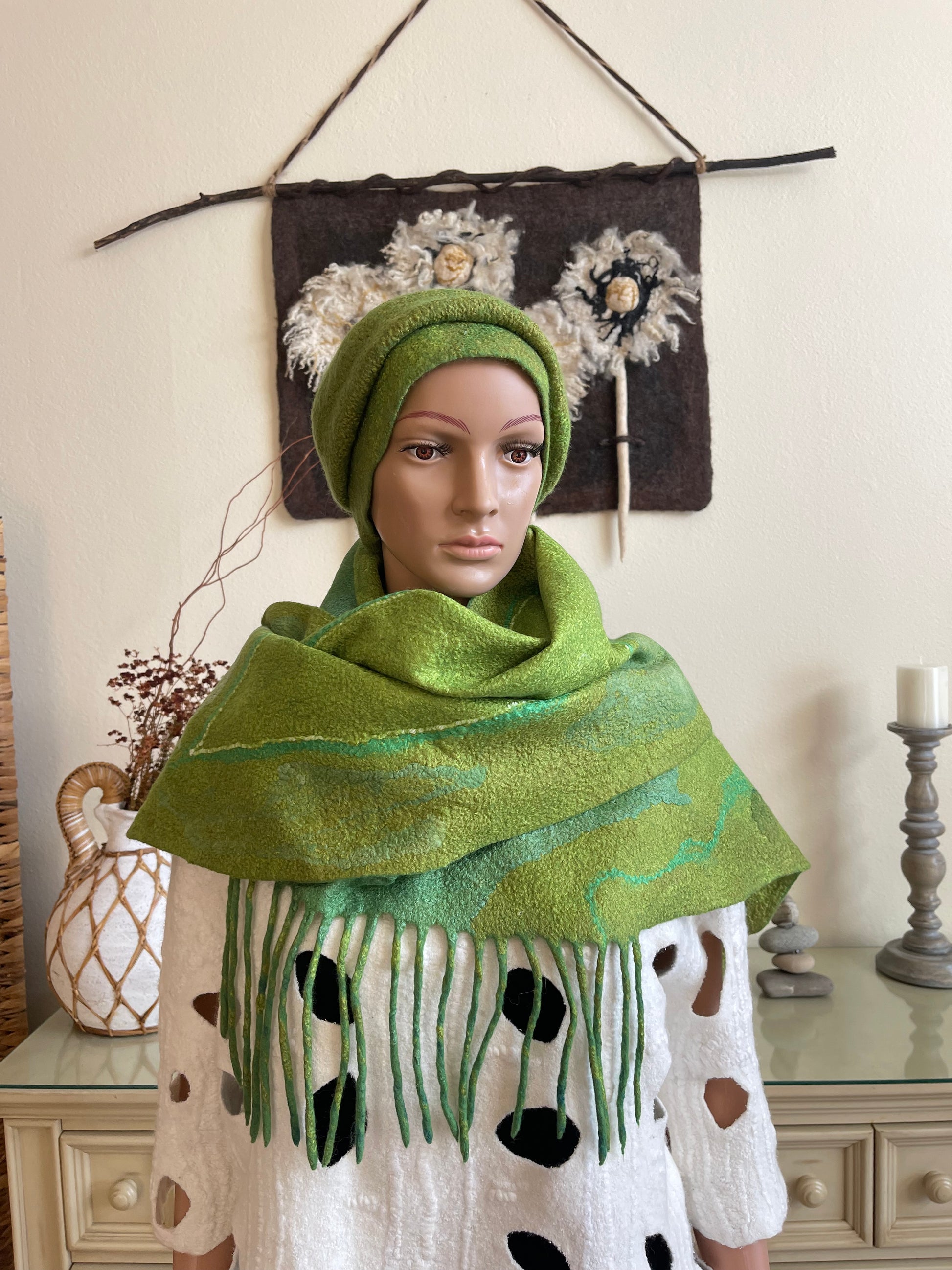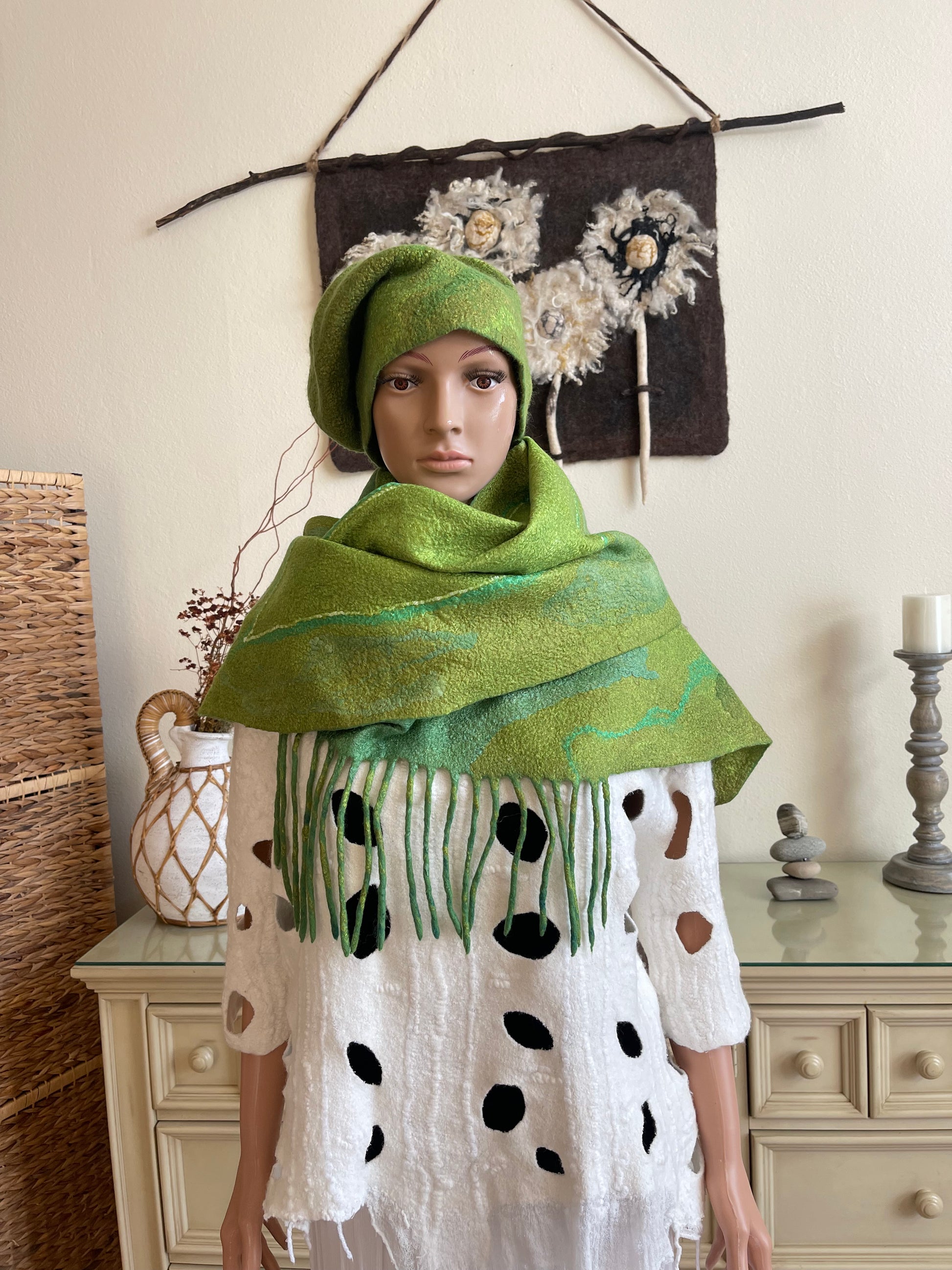 Natural Wool Silk Hat Scarf Set Unique Handmade Felted Beanie Wrap Ecofriendly Headwear Neckwear Bohemian Cozy Warm Artisanal Bonnet Muffler