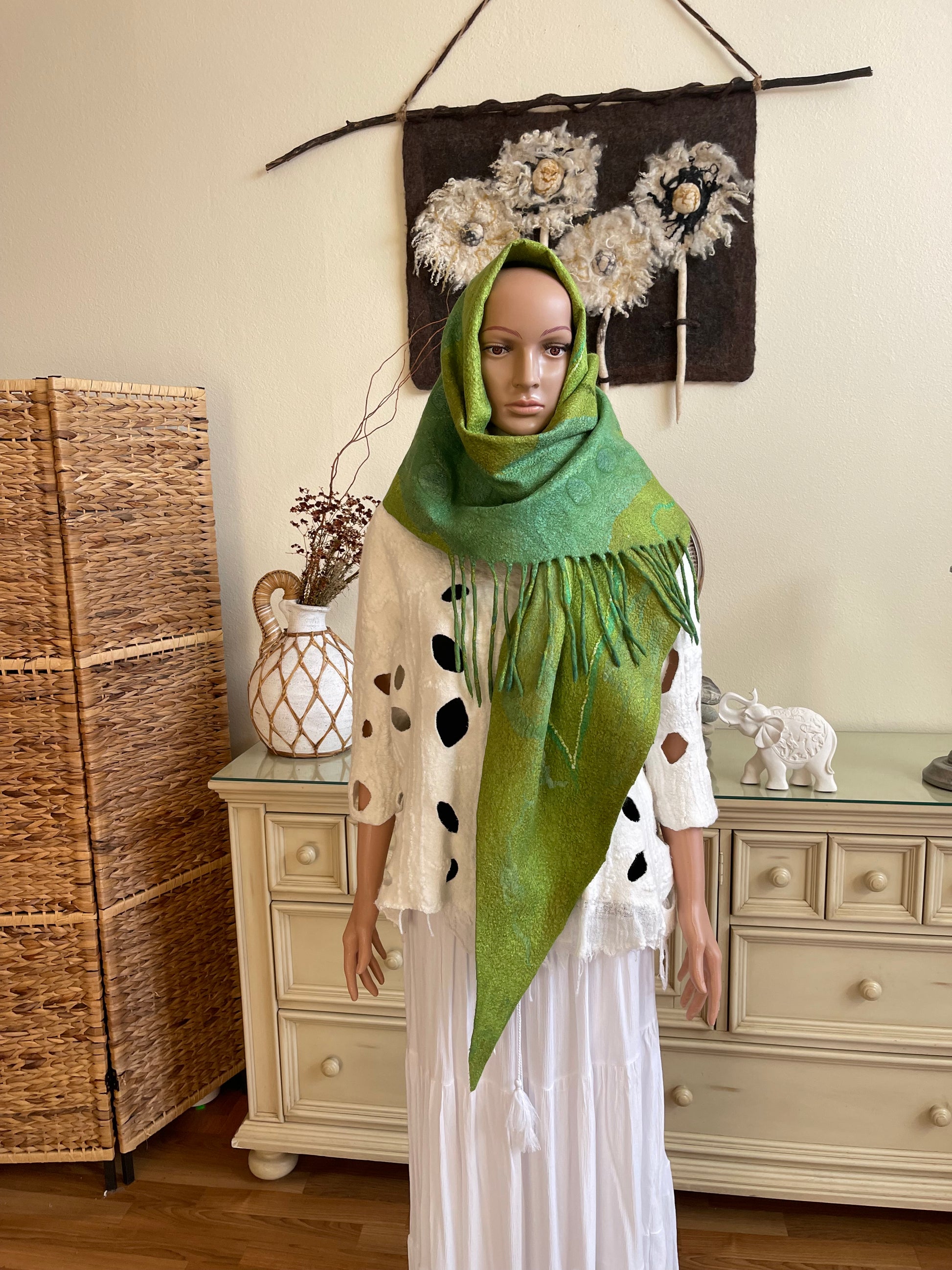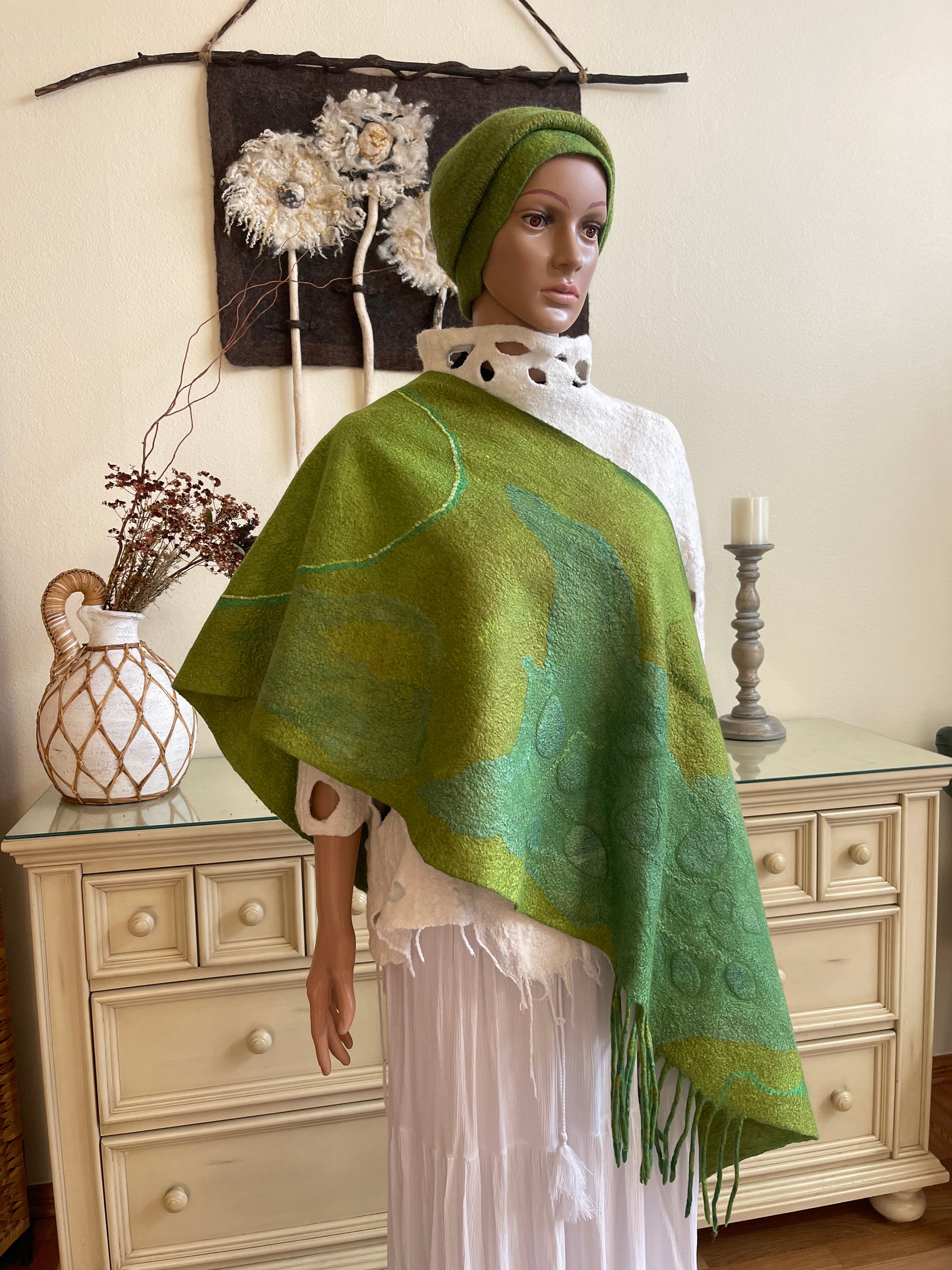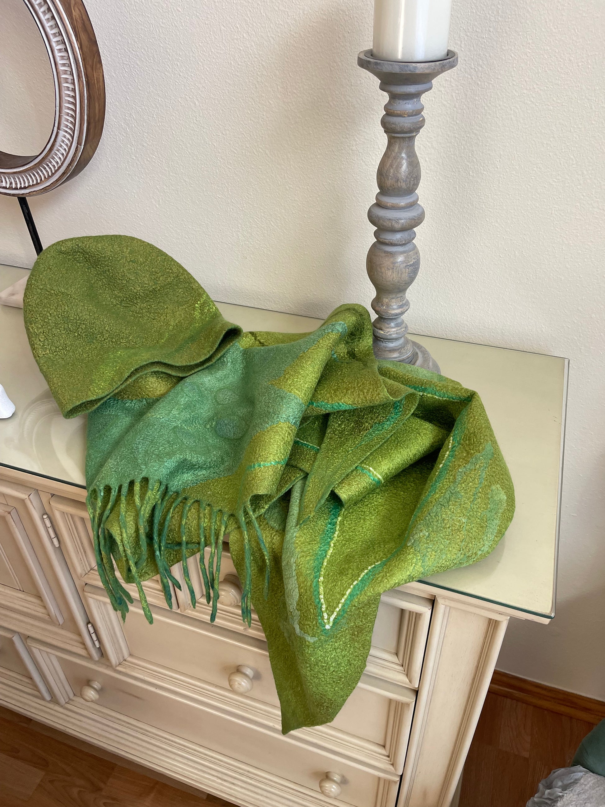 This two sides wearable unique hat and scarf set made from unique, warm and soft merino wool ,silk, cotton, bamboo, linen ,nettle , tencel, viscose .Made in of wet felting technique. Completely handmade. Author's design. Warm, cozy and pleasant tactually. Recommendations for care - No washing machine . Hand wash. 1. Place the item in room temperature water with soap for wool and silk fabric and soak it for couple hours or overnight. 2. let it drain squeeze it,don’t twist it and put it in room temperature water for rinsing. 3. Rinse gently ,do not twist, let the water runoff. 4.Gently stretch to get the original shape. 5.Spread it on the towel and let it dry. 6.You can iron it with steam at wool and silk settings. Feel free to ask me any questions. Real colors may be slightly differen from their appearance on your display, as it depends on your monitor settings. Thanks for visiting my store, take a look at my other items and let me know if you have any questions.Bactus Muffler Snood